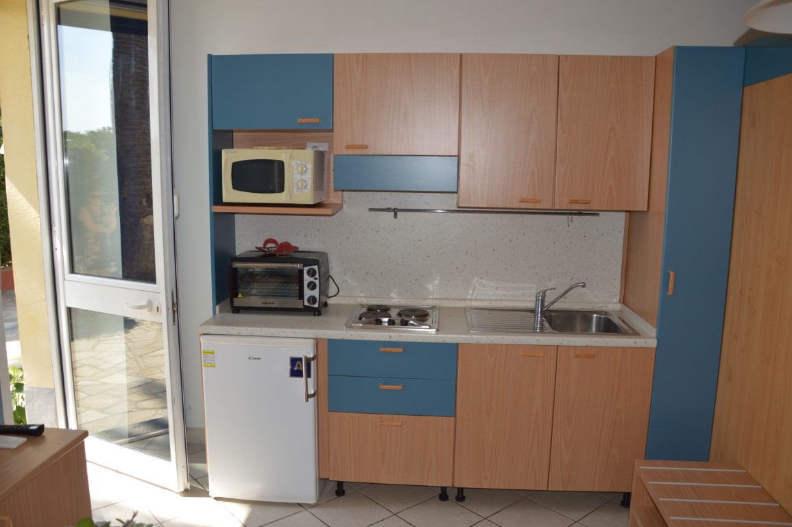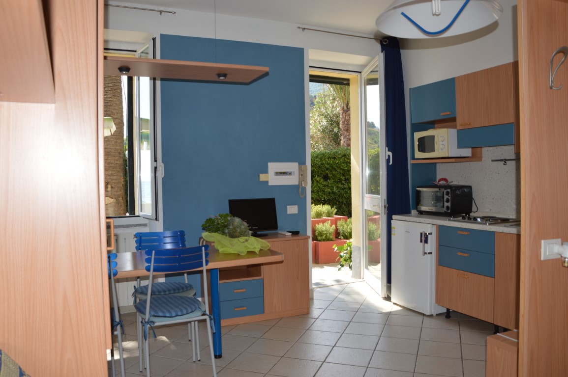 Studio flat on the ground floor composed by a living room with kitchenette and single sofa bed, bathroom and double bed.