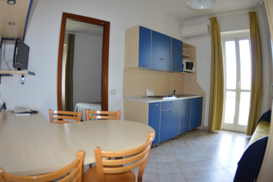 Il bilocale è composto da soggiorno con angolo cottura e divano letto singolo, bagno e camera con letto matrimoniale e un letto singolo